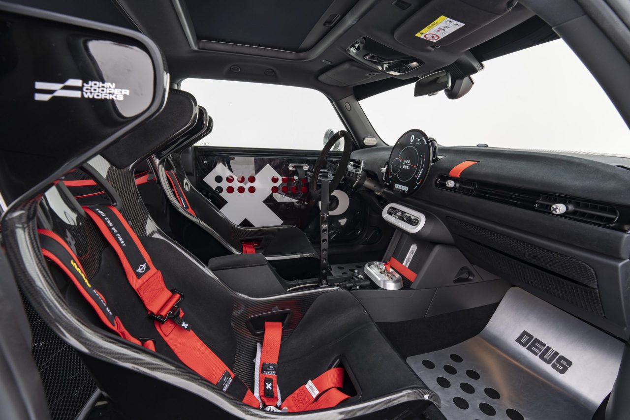 La interiorul lui MINI JCW „The Machina” tema cu inspirație din motorsport se continuă într-un mod foarte pronunțat. Aici se pune accentul atât pe simplitate și ergonomie, cât și pe siguranța eventualului șofer, sau mai bine zis, pilot.