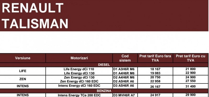 Renault Talisman a ajuns si in Romania iar pretul lui pleaca de la 21.800 euro pentru echiparea LIFE. Astfel, noul model vine sa completeze concurenta segmentului mediu unde batalia se da intre VW Passat, Ford Mondeo sau Hyundai i40.