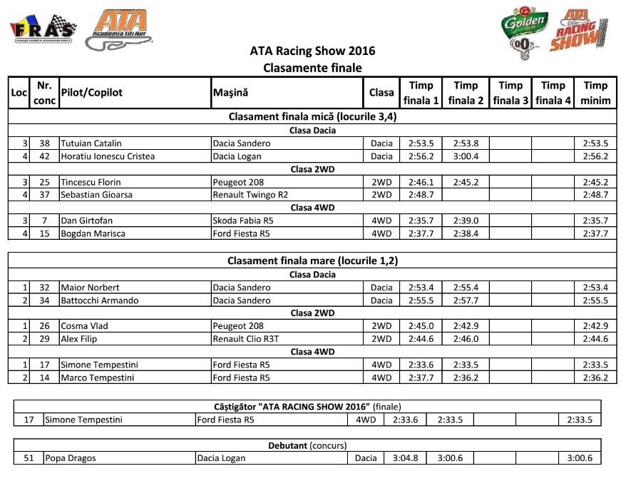 ATA Racing Show 2016 a fost dominata in ambele zile de Simone Tempestini (Ford Fiesta R5), care a fost cel mai rapid pilot, atat in antrenamentele si calificari, cat si in mansele de concurs si finala. Campion mondial de juniori si campion national en-titre, Tempestini a cucerit la ATA Racing Show 2016 trofeul la general, dar si Clasa 4WD (masini cu tractiune integrala). De fapt, la clasa, a fost «o afacere de familie», pentru ca pe locul doi a terminat tatal sau, Marco Tempestini (Ford Fiesta R5), in timp ce pe pozitia a treia s-a clasat Dan Girtofan (Skoda Fabia R5).