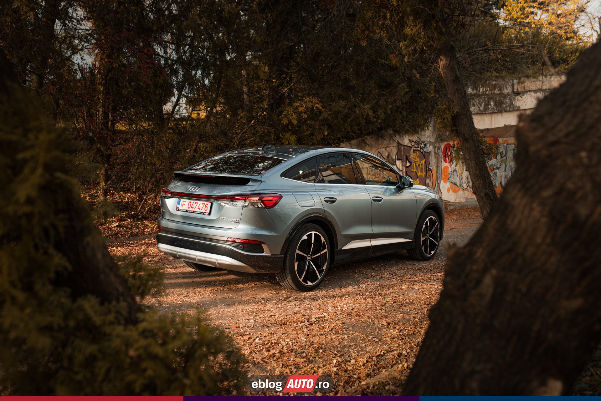 Vă mai amintiți câtă vâlvă a făcut Audi E-Tron când a apărut pe piață? SUV-ul electric al producătorului ce susține motto-ul „Vorsprung durch Technik” avea să impresioneze prin liniile sale, prin lipsa oglinzilor retrovizoare și prin autonomia peste medie la acea vreme. Audi Q4 Sportback 50 E-Tron Quattro nu este doar un SUV electric cu un nume kilometric, ci reprezintă distilarea lecțiilor învățate de Audi de la primul E-Tron. Q4 E-tron aduce aminte foarte mult de E-Tron-ul original, dar reprezintă o versiune pentru mase a SUV-ului electric exclusivist. Deși vremea de afară nu era prietenoasă, mașina a avut aproximativ 300 km autonomie, grație pompei de căldură, iar performanțele urbane ale acestui model te fac să îți pui eterna întrebare – de ce nu conducem cu toții mașini electrice în oraș? Răspunsul e simplu – infrastructură, costuri, etc – dar aceea este o altă discuție pentru altă dată. Ce e important acum este ca Q4 E-Tron este un SUV electric Audi din toate punctele de vedere, iar acest lucru este din ce în ce mai evident pe măsură ce utilizezi mașina pe o perioadă îndelungată.
