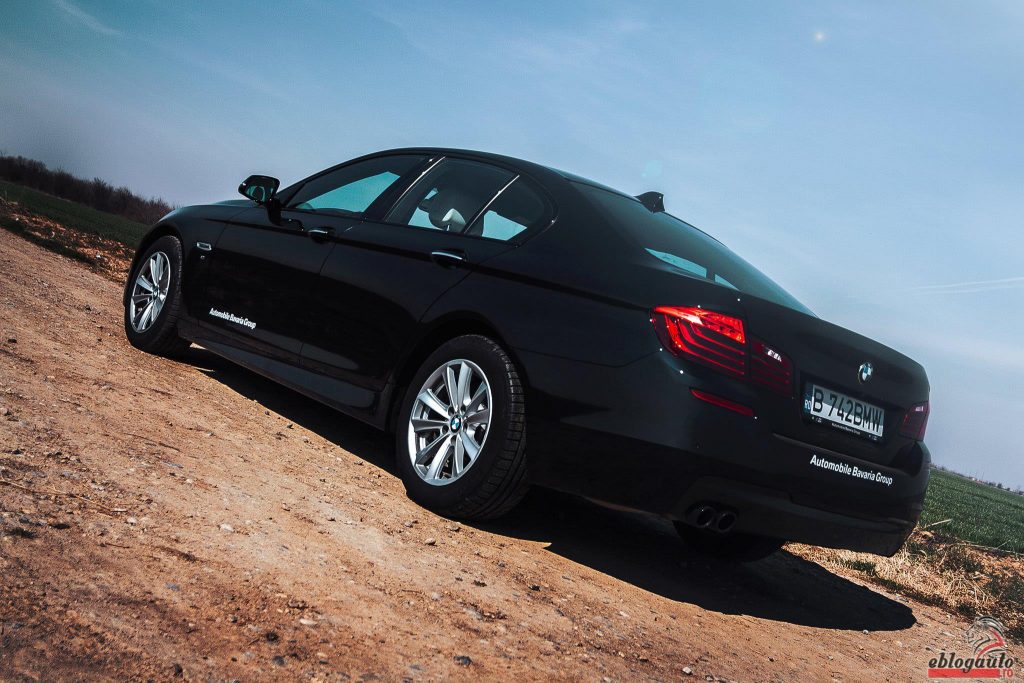EXTERIOR: Exteriorul masinilor nemtesti este de obicei sobru, subtil si cat mai business cu putinta si Seria 5 nu face exceptie. Singurul lucru ce ar putea sa iasa putin in evidenta la modelul testat de noi este ca masina era dotata cu pachetul optional M Sport ceea ce ii ofera kit-ul aerodinamic M si jantele din aliaj usor Double-Spoke de 18”. Farurile adaptive LED confera masinii o figura foarte interesanta si agresiva, mai ales noaptea cand luminile sunt aprinse iar teava de esapament vopsita in negru contribuie cu brio la look-ul agresiv. Foarte interesanta a fost si vopseaua masini care parea neagra la prima vedere dar in bataia soarelui se transforma intr-un albastru ca cel din cerneala pe care o foloseam in clasa I. Melancolia a fost binevenita.