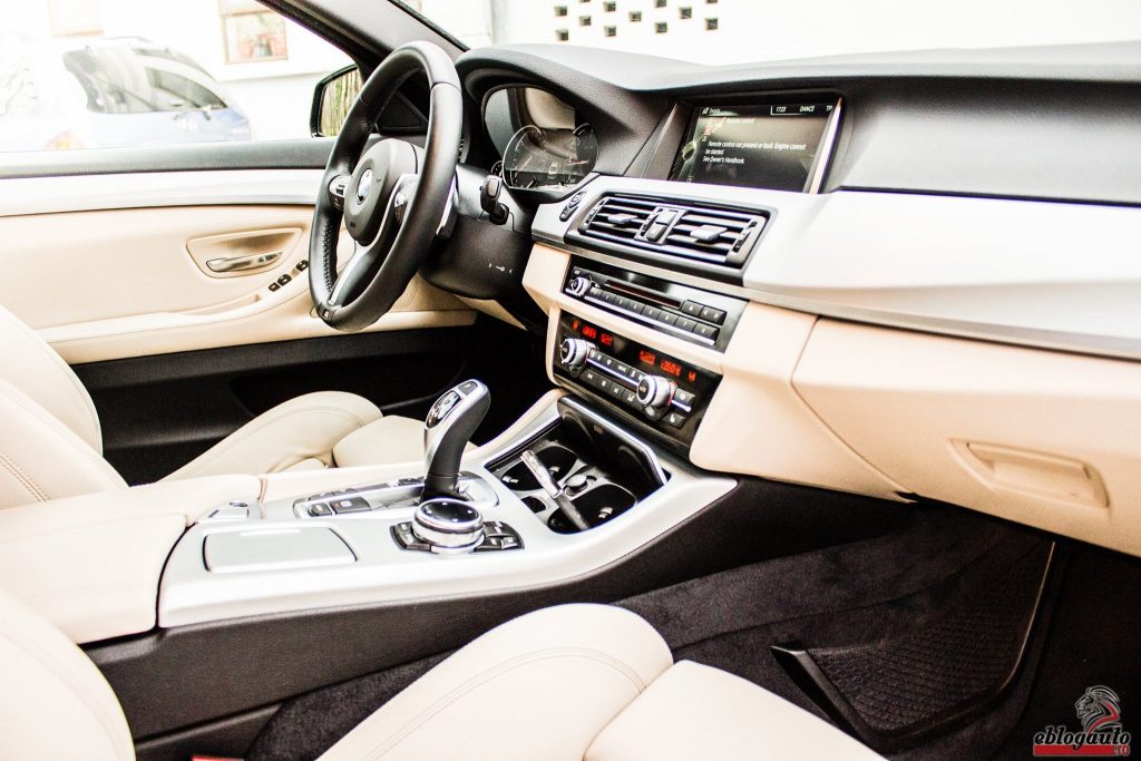 INTERIOR: La interior te intampina un ecran pe mijlocul habitaclului ce gazduieste sistemul iDrive, materiale premium oriunde pui mana si un sentiment general de calitate. Dovada a calitatii interioarelor BMW sunt modele mai vechi ale bavarezilor care dupa 5-10 ani inca mai au interioare care rezista testului timpului. Nici interiorul modelului de fata nu pare sa faca exceptie de la regula: totul pare bine inchegat si usor de recunoscut pentru fanii marcii. O mentiune speciala vis-a-vis de interior o primeste volanul M Sport care pare a fi perfect din punct de vedere al marimii si texturii. Un punct in minus se acorda interiorului pentru faptul ca e acelasi pentru toate modelele. In orice caz, asta nu inseamna ca interiorul nu emana calitate prin materiale si imbinarea acestora. In spate e destul loc si pasagerii beneficiaza de o consola centrala multifunctionala pe care pot stoca pahare si diferite alte obiecte. Ca sa inchei capitolul voi spune ca interiorul te face sa intelegi de ce ai platit atatia bani pe aceasta masina si ca banii tai au fost bine investiti.