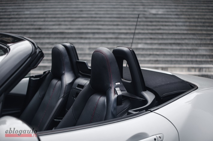 Ei, aici avem si cateva negative. Interiorul nu are cele mai bune finisaje din lume pe alocuri, iar unele balamale ce sunt folosite pentru a ascunde diferite spatii de depozitare par foarte firave. In ciuda faptului ca unele materiele sunt dure la atingere, par ca vor rezista cu usurinta timpului, iar design-ul se potriveste cu tema sportiva a masinii. Ceasurile de bord sunt simple si usor de citit iar comenzile pe volan iti permit sa ramai si mai mult concentrat la condus in timp ce iti alegi postul preferat la radio. Imi place ca cei de la Mazda nu s-au lasat dusi de val cand a venit vorba de tehnologie in habitaclu: nu exista buton de “Sport”, nu exista nicio vrajitorie electronica. Masina aceasta este ceea ce este si nimic mai mult sau mai putin!