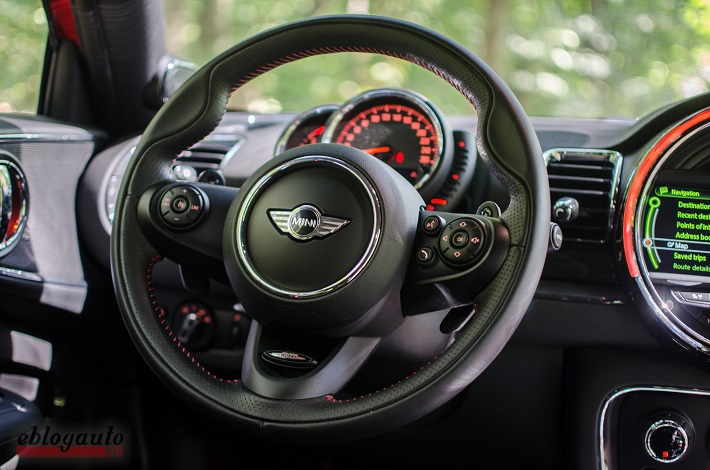 Volanul este îmbrăcat în piele fiind parte a pachetului John Cooper Works leather steering wheel, iar manevrabilitatea acestuia a fost pe placul meu, mai ales când vine vorba de padele sau comenzile de pe volan. Deși este o mașină sport, cei de la MINI au reușit să îi dea o notă de eleganță atât prin pachetul Chrome Line Interior, cât și prin schimbătorul de viteze îmbrăcat în piele, cu un aspect futurist. Butoanele de pe bord își păstrează design-ul caracteristic unui MINI, fiind asemănătoare cu cele de la bordul unui avion (pe lângă aspect, se acționează în sus și în jos), iar buton central, cel de Start/Stop, luminează mai puternic în momentul apăsării pedalei de frână.